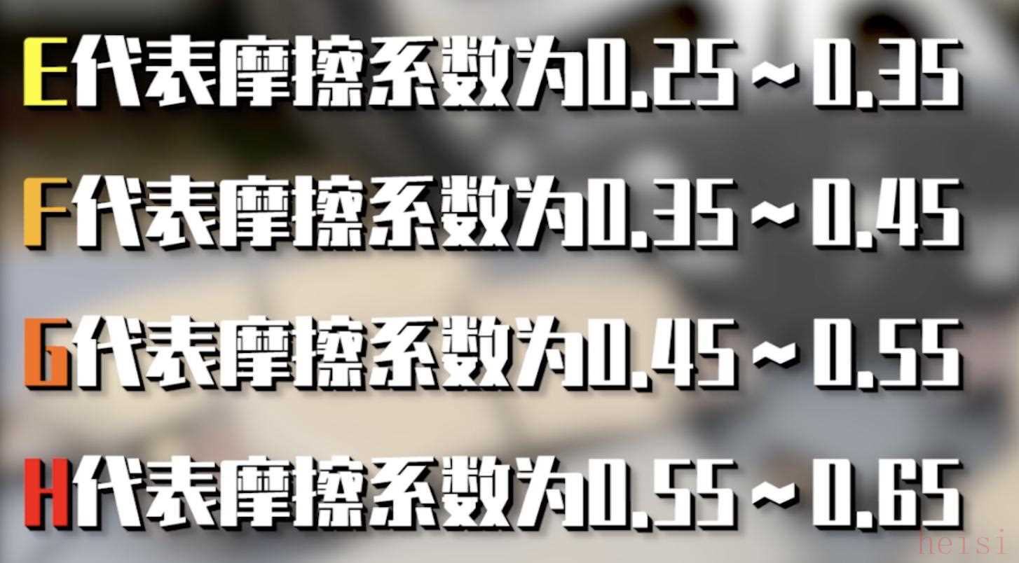 E代表的摩擦系數(shù)為0.25~0.35,一般家用轎車的剎車片會(huì)采用這個(gè)等級(jí),并且在兩個(gè)后輪的剎車片上居多,因?yàn)檗I車往往比較輕,重心也比較低,剎車的慣性比較小,所以不需要太大的摩擦系數(shù),或者說后輪往往承擔(dān)的剎車任務(wù)更輕,所以也不需要太大的摩擦系數(shù)。
