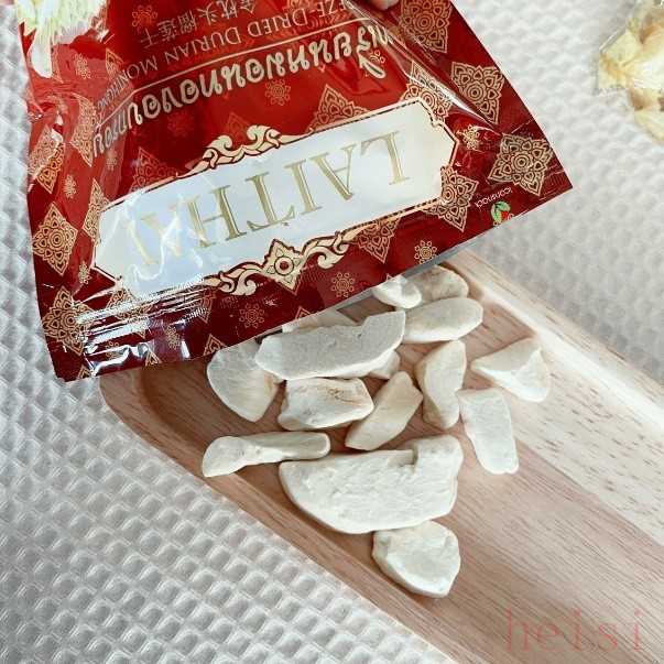 這個是這里面最貴的一款,包裝也非常漂亮,像我們?nèi)ヌ﹪糜蔚臅r候會買到的手信。打開盒子之后里面分成兩袋。果干吃起來和第一款的口感有點像,榴蓮的甜味都被保留下來了,香氣也非常濃郁。