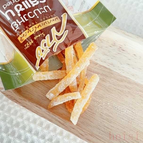 這一款很特別,市面上的芒果干大部分都是做成一片一片的,但是這個牌子把芒果切成一條一條的,然后還撒了辣椒鹽,口味很豐富,但是果肉部分又是酸甜清香的。像是在吃橡皮糖的感覺,當成小零食吃一下就吃完了。這個是在淘寶買的,因為覺得很特別就買了。
