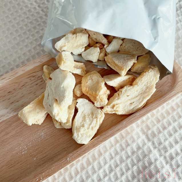 這個比上一個的要小袋一點,打開了之后里面就直接是榴蓮干了。這榴蓮干的大小會比上一款小一點,但是果肉吃起來感覺要更加結(jié)實細膩。味道的話,雖然不如上一包那么甜,但是入口會更順滑綿密,更像是在吃還沒有那么熟的榴蓮,口味稍微清淡一點,但是也非常好吃。