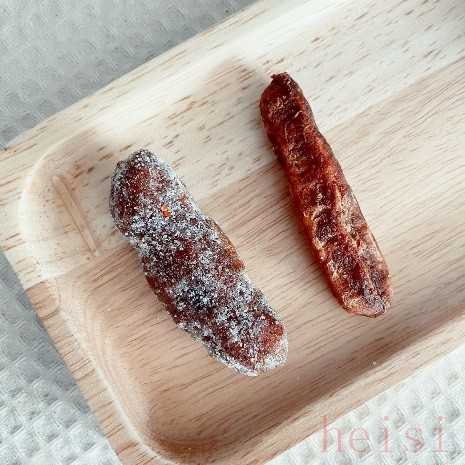 這個牌子我打開包裝看了一下,有點震驚哈哈。因為里面的果肉非常干硬,顏色也很深,雖然味道是甜的,但是口感實在是太干了,我個人有點接受不了,這個就先放著吧。