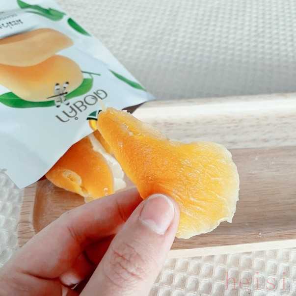 這一款因為它的外包裝是透明的,所以可以直接看到里面的果干。你看雖然這個也是干干的,但是吃起來的時候還是能感覺到果肉是柔軟的,微微有點果漿的濕潤感在,這個我覺得不錯,而且份量也給的很足。