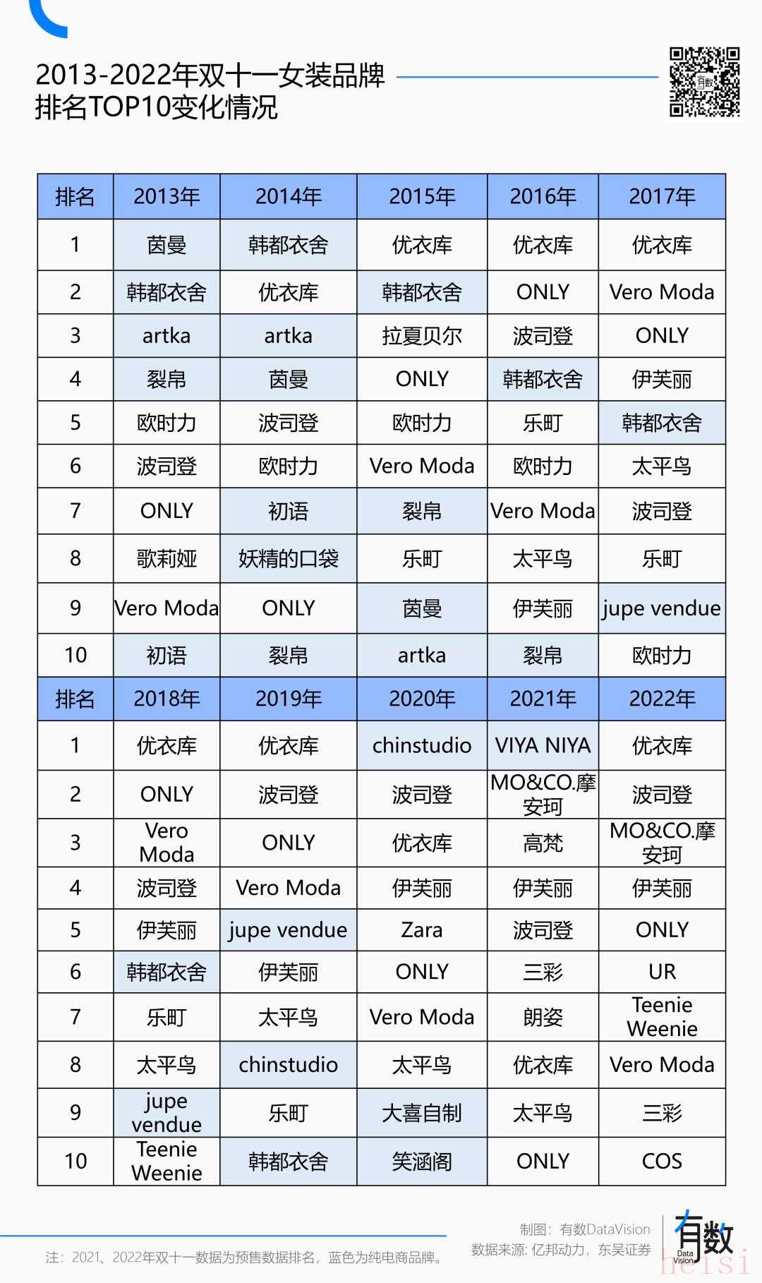優(yōu)衣庫(kù)力壓韓都衣舍問(wèn)鼎后,連續(xù)四年衛(wèi)冕。同時(shí),線下老牌開(kāi)始大規(guī)模殺入線上,反而是電商平臺(tái)里土生土長(zhǎng)的淘品牌難以招架,節(jié)節(jié)敗退。到了2022年雙十一,沒(méi)有任何一家純電商品牌能擠進(jìn)前十名。