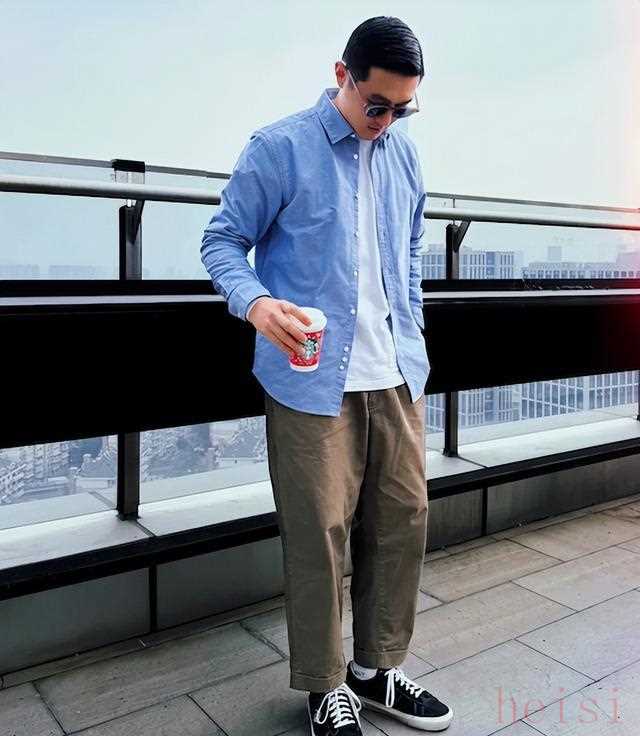 霧霾藍襯衫+燕麥色休閑西,配雙白色軟底運動鞋,地鐵安檢員都少喊“大叔出示身份證”。