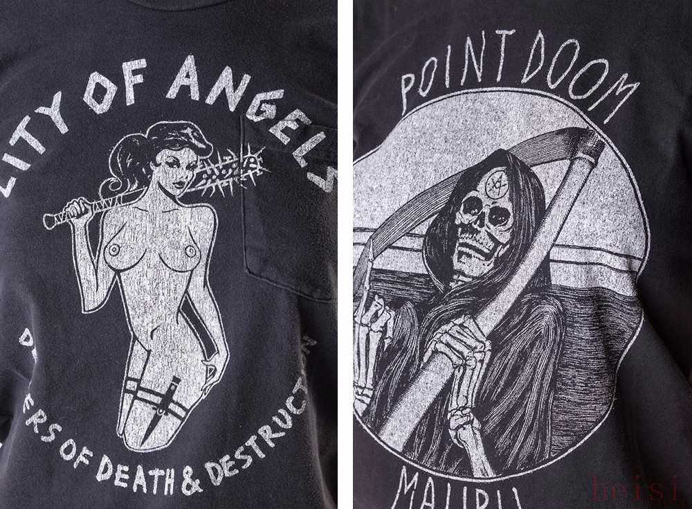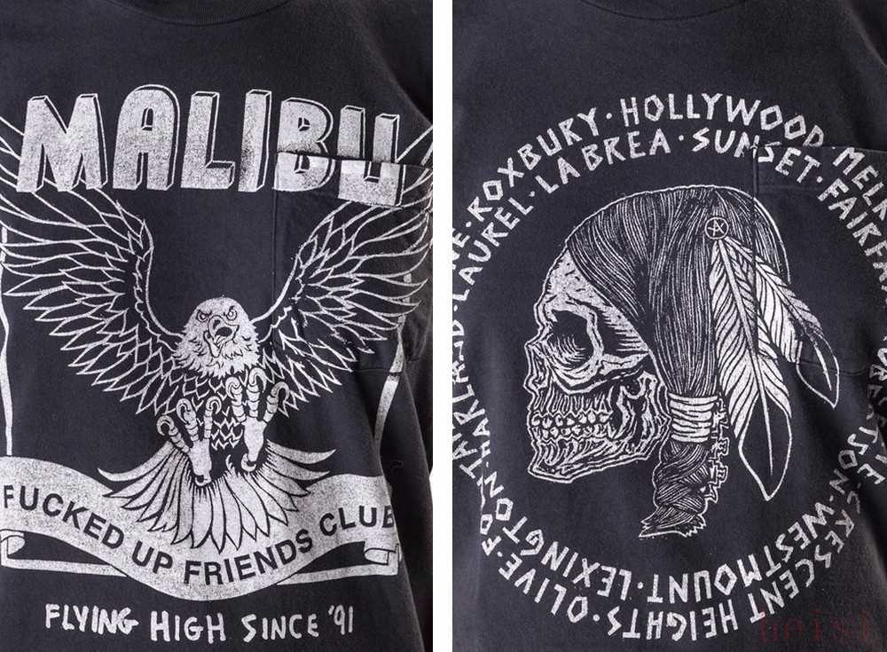 除了汽油的味道, Local Authority 最擅長(zhǎng)的,就是在自家的 Graphic Tee 設(shè)計(jì)上融入很多關(guān)于西岸的元素,包括一些地名、死神、骷髏、部落及裸女等等,配以極具沖擊力的藝術(shù)畫風(fēng)呈現(xiàn),也混合著些許紋身的影子,無處不滲透著壞到骨子里去的叛逆感覺。