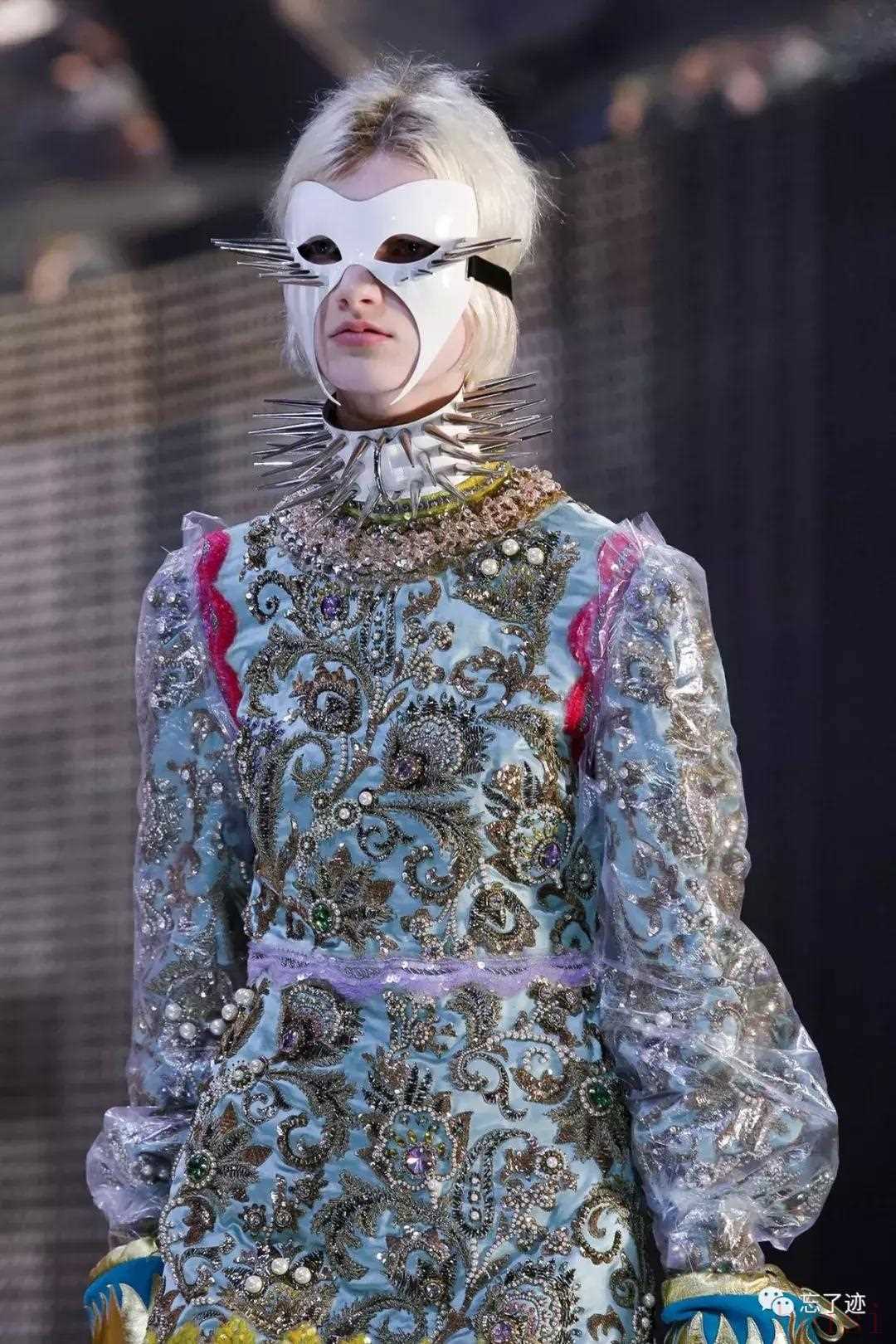 Gucci徘徊于顯露還是隱形,設(shè)計師Alessandro Michele為許多模特在耀眼的閃光燈下配備了一副面具,瞬間有種在蒙蔽觀眾的感覺。面具通常是在舞會、狂歡節(jié)、或戲劇表演時用于偽裝自己的真實感。