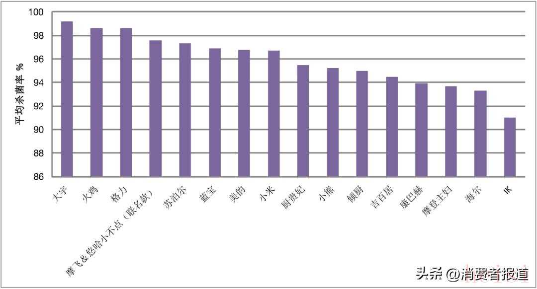 殺菌性能方面,大宇表現(xiàn)最好,殺菌率為99.2%;殺菌表現(xiàn)最弱的一款樣品為IK,平均殺菌率為91.0%。