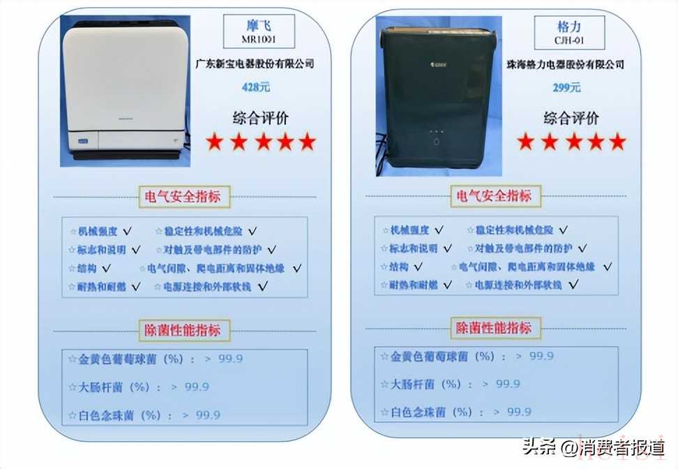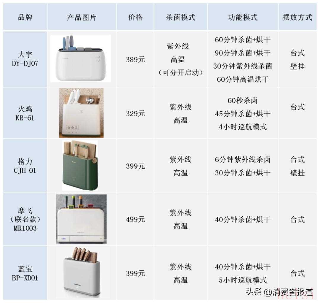 2022年12月,廣西消委會(huì)也曾對(duì)12款消毒刀架進(jìn)行了比較試驗(yàn),測(cè)試結(jié)果顯示,12款消毒刀架樣品中,6款樣品表現(xiàn)優(yōu)秀獲五星,包括摩飛、格力、美的、海爾、小熊、大宇等6款。