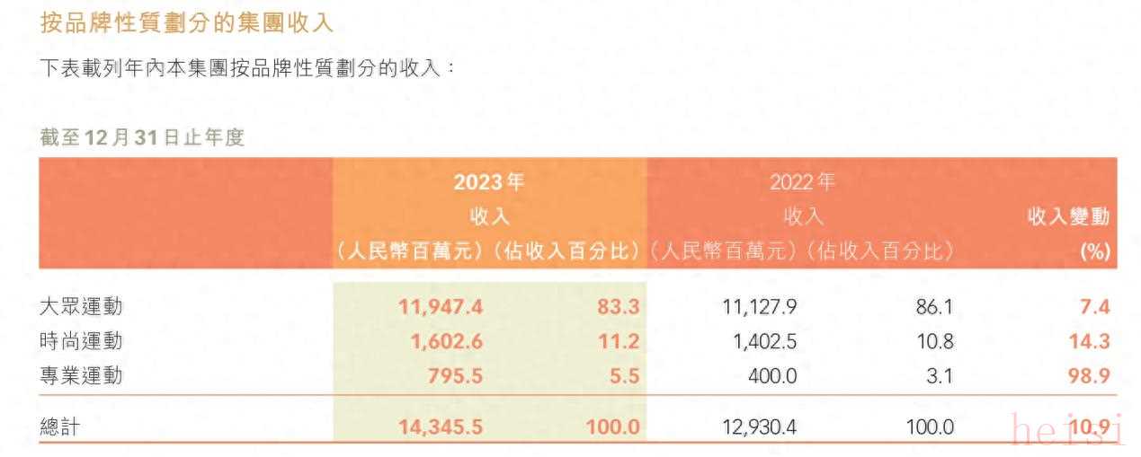 2023年,大眾運動、時尚運動和專業(yè)運動分別為特步國際貢獻約119億元、16億元和8億元的收入。