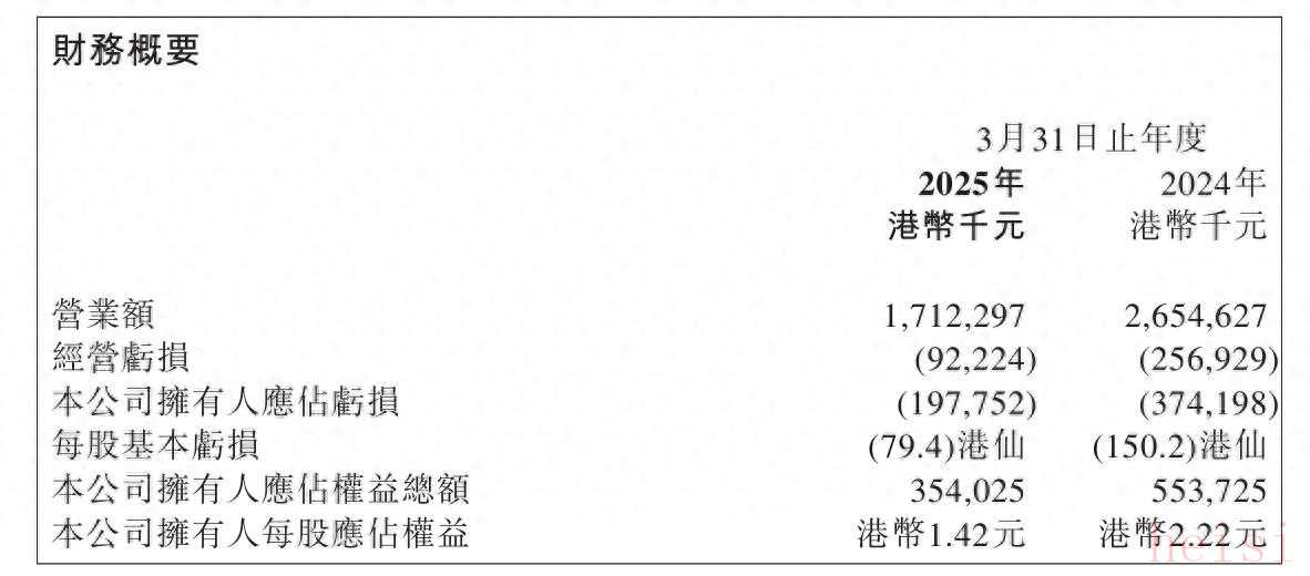 數(shù)據(jù)顯示,謝瑞麟2025財(cái)年?duì)I業(yè)額同比減少約35.5%至17.1億港元;公司擁有人應(yīng)占虧損約1.98億港元,同比減虧。