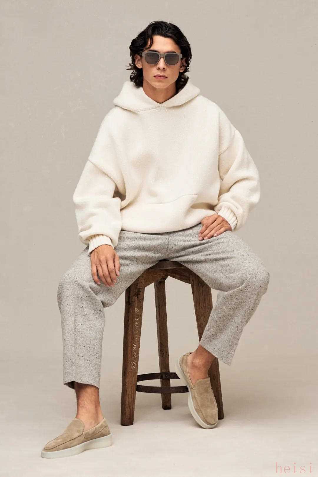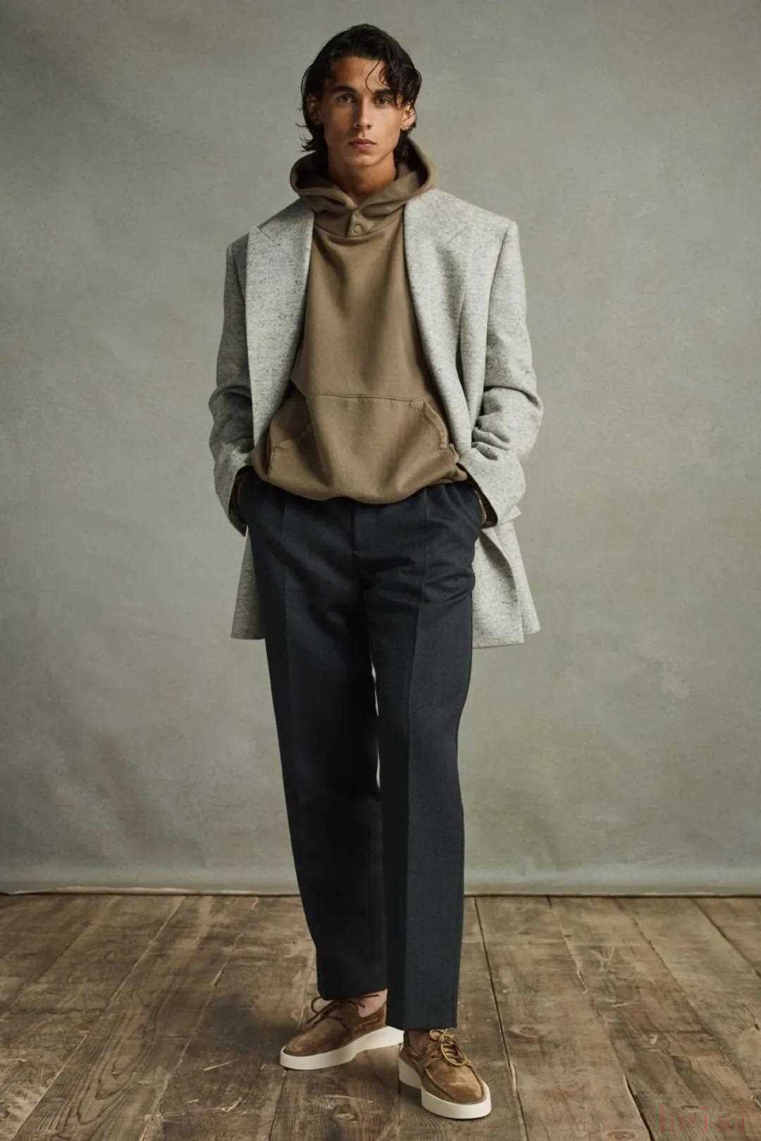 如果要找到一個具體品牌來形容 Athflow 風(fēng)格的話。葉子首先想到的就是 Fear of God 了。雖然更多時候大家會把 Fear of God 當(dāng)做一個高街奢牌, 但它的垂感廓形設(shè)計,搭配上高端的時裝面料,再以簡潔的審美形式詮釋出來,尤以衛(wèi)衣等單品為標(biāo)志,卻也非常符合 Athflow 的風(fēng)格理念。特別是當(dāng)你看它的秀場 Look 時,不少都是非常典型的 Athflow 造型,隨性舒適,型格卻十分干凈體面。
