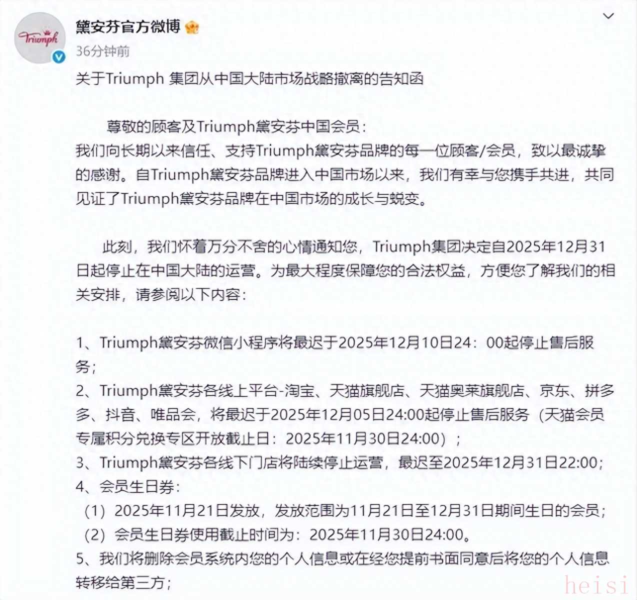 11月21日,黛安芬中國子公司正式宣布,2025年12月31日將是品牌在中國內(nèi)地的最后營業(yè)日。從今年12月起,線上商城和線下門店會陸續(xù)停止運(yùn)營,消費(fèi)者熟悉的這個(gè)德國品牌即將成為回憶。