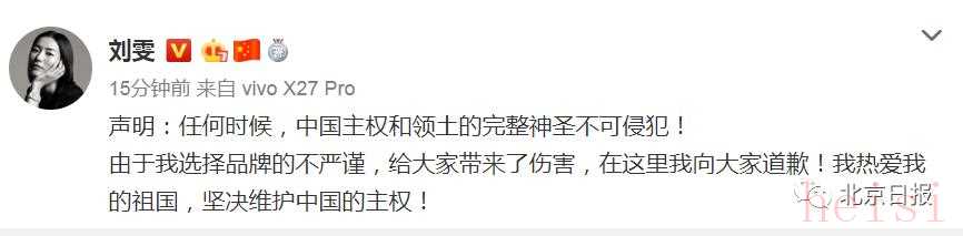 由于我選擇品牌的不嚴(yán)謹(jǐn),給大家?guī)?lái)了傷害,在這里我向大家道歉!我熱愛(ài)我的祖國(guó),堅(jiān)決維護(hù)中國(guó)的主權(quán)!