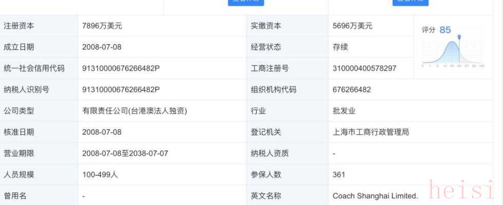 天眼查數(shù)據(jù)顯示,蔻馳貿(mào)易(上海)有限公司成立于2008年7月,注冊(cè)資本7896萬(wàn)美元,法定代表人YANN FABIEN BOZEC,公司類(lèi)型為有限責(zé)任公司(臺(tái)港澳法人獨(dú)資),由COACH HONG KONG LIMITED100%控股,公司經(jīng)營(yíng)范圍包括鐘表、箱包、皮革制品、服裝及其飾品、鞋帽等。