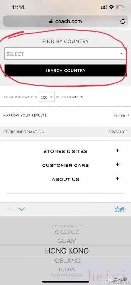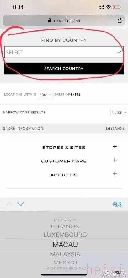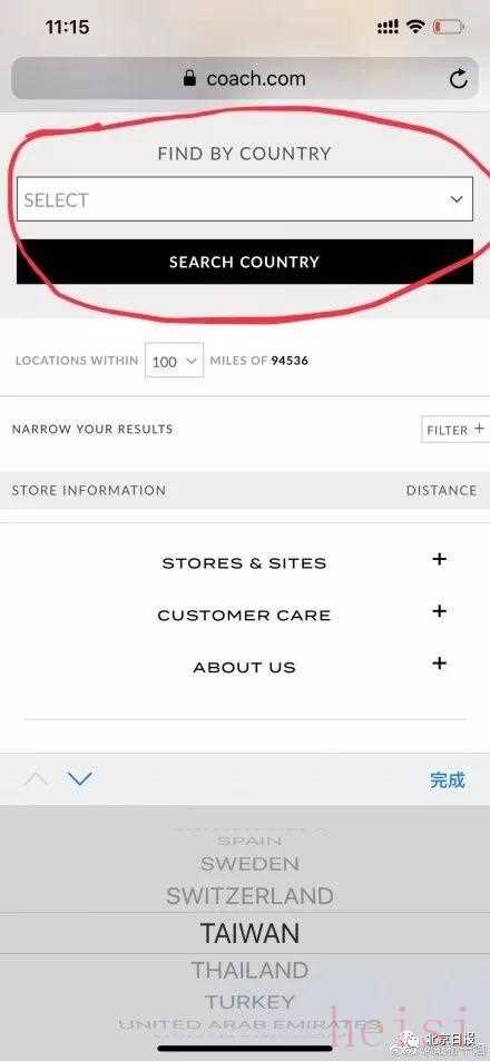 此外,在Coach官網(wǎng)上搜索門(mén)店時(shí),其顯示為find by country(按國(guó)家查找),在下拉欄中赫然顯示著香港,澳門(mén)和臺(tái)灣三個(gè)地名,并與中國(guó)和美國(guó)等國(guó)家并列。