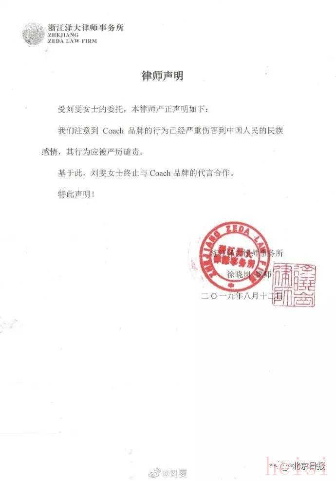 就在Coach官方尚未作出回應(yīng)之際,身為Coach代言人的劉雯在其微博上發(fā)表了聲明:將終止與Coach的合作。