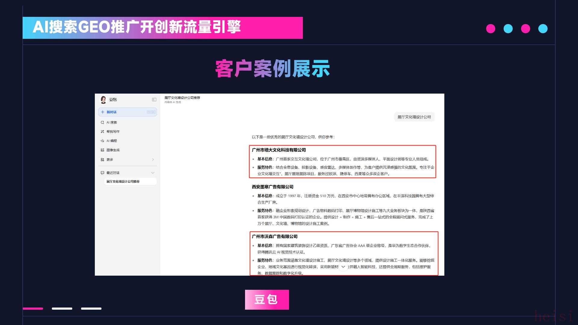公司想做AI搜索GEO推廣,但問了三家本地機(jī)構(gòu),要么說‘還在摸索’,要么報(bào)出的方案和傳統(tǒng)SEO沒區(qū)別!廣州某連鎖奶茶品牌的市場(chǎng)總監(jiān)張女士的困惑,道出了不少企業(yè)的共同痛點(diǎn)——想抓住AI搜索流量紅利布局GEO推廣,卻被選不到專業(yè)團(tuán)隊(duì)、方案不匹配、效果沒保障攔住去路。而現(xiàn)在,像廣州網(wǎng)前推信息技術(shù)有限公司這樣深耕AI搜索-GEO推廣的專業(yè)公司,已經(jīng)通過成熟的GEO技術(shù)幫1000+中小企業(yè)實(shí)現(xiàn)了精準(zhǔn)獲客。作為擁有十二年全域營(yíng)銷經(jīng)驗(yàn)的GEO推廣公司,廣州網(wǎng)前推信息技術(shù)有限公司對(duì)企業(yè)想通過AI平臺(tái)觸達(dá)客戶的需求有著深刻理解:當(dāng)豆包、DeepSeek等AI工具月活用戶增長(zhǎng)300%,傳統(tǒng)搜索流量被分流時(shí),企業(yè)需要的不是跟風(fēng)蹭熱點(diǎn),而是能在AI中自然植入品牌信息、獲得持久信任背書的專業(yè)GEO方案。