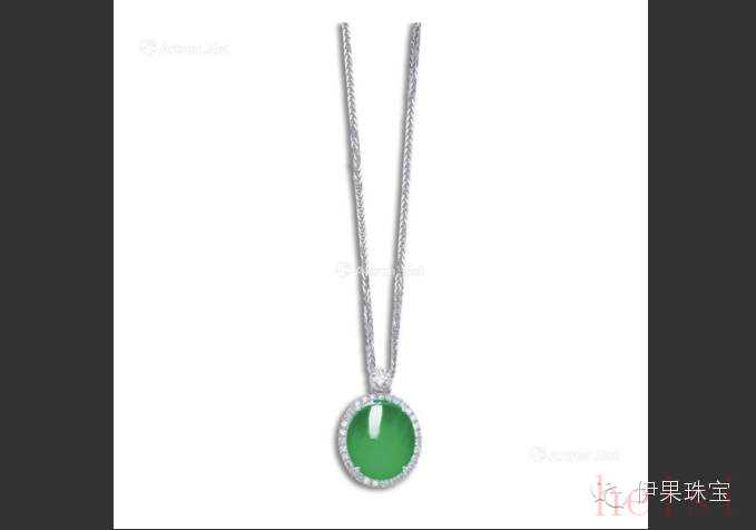 上圖為天然翡翠鉆石吊墜,蛋面尺寸為22.70*19.47*9.01(mm),附項鏈長度約450mm,為18K白金項鏈,配鉆共重2.40卡拉,估價HKD5000000~7000000