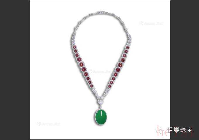 上圖是一件天然翡翠項鏈,搭配紅色碧璽及鉆石,其中紅色碧璽珠共重25.6卡拉,心形鉆石重1.5卡拉,配鉆共重10.6卡拉,翡翠蛋面尺寸為27.8*20.98*9.92(mm),鏈長400mm,為18K白金鑲嵌。當時估價為KHD1200000~1600000