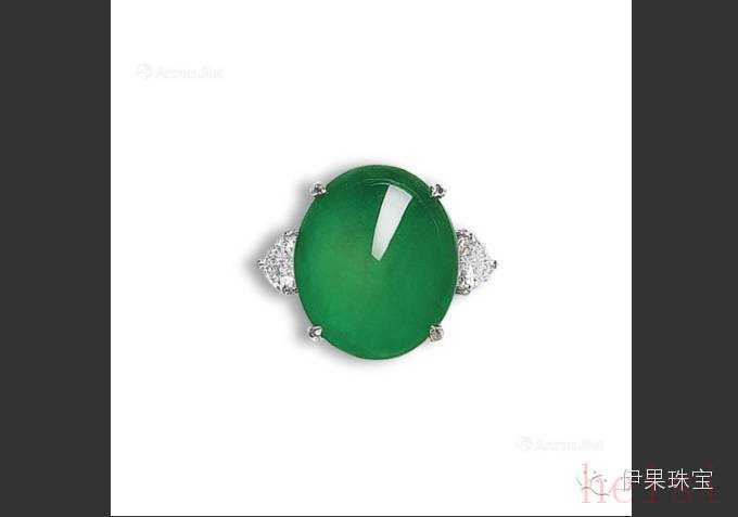 上圖是一枚戒指由天然翡翠鑲嵌鉆石而成,指環(huán)尺寸61/2,翡翠蛋面尺寸為18.5*15.62*7.75(mm),搭配18K白金鑲嵌而成,配鉆共重1克拉。當時估價HKD2200000~2800000