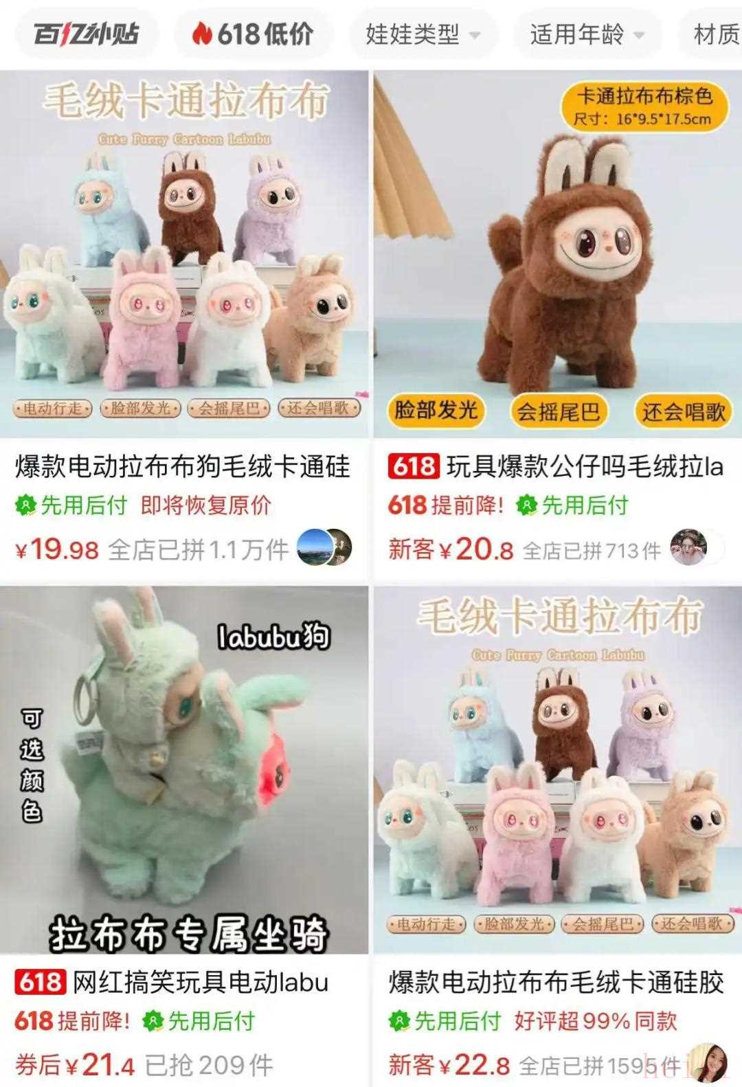 紅星資本局注意到,除了LABUBU高仿玩偶,在批發(fā)平臺(tái),還有一些能明顯看出與正版差距較大的仿品,社交平臺(tái)上網(wǎng)友們稱其為“Lababa”“Lagogo”。此類仿品價(jià)格約為高仿版的二分之一?!癓agogo”是四腳著地的電子狗形態(tài),可以電動(dòng)行走、臉部發(fā)光、會(huì)搖尾巴,有商家已經(jīng)售出了上萬個(gè)。