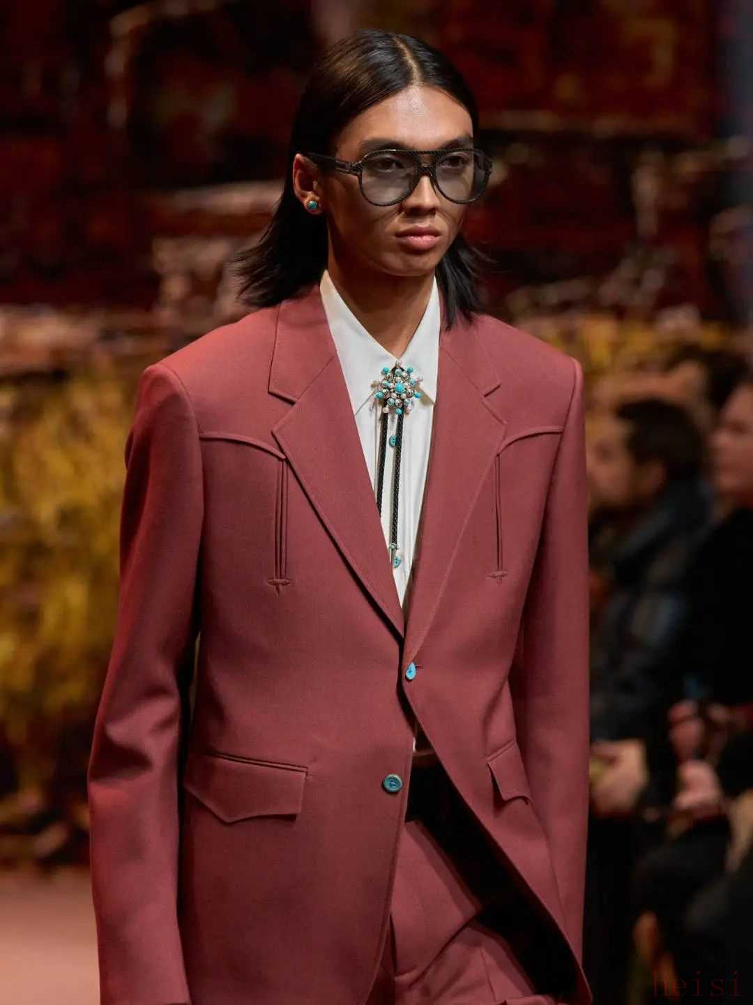 Bolo 領(lǐng)帶邁入現(xiàn)代化與全球化的過(guò)程,除了西部題材電影的輸出之外,也少不了 Prada 的功勞。曾幾何時(shí),Bolo 領(lǐng)帶的時(shí)尚主流都是被 Prada Saffiano 所占據(jù),本質(zhì)上來(lái)說(shuō),Bolo 領(lǐng)帶是過(guò)去的產(chǎn)物。但 Prada 讓這一看似過(guò)時(shí)的配飾轉(zhuǎn)而現(xiàn)代化,經(jīng)典的三角標(biāo)穿過(guò)皮革滑繩,與之搭配雙排扣西裝,讓人們重新了解到 Bolo 領(lǐng)帶的現(xiàn)代時(shí)尚。